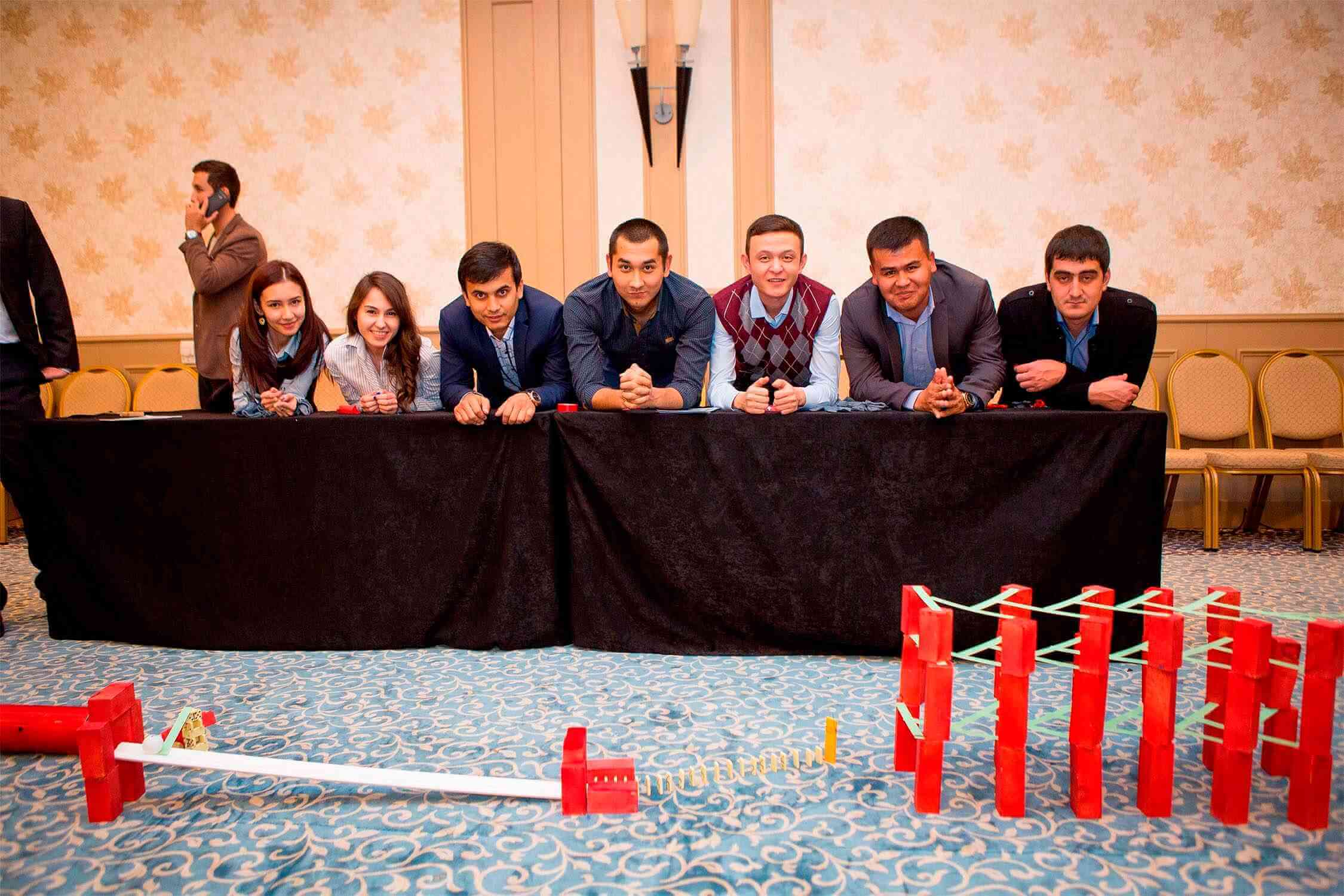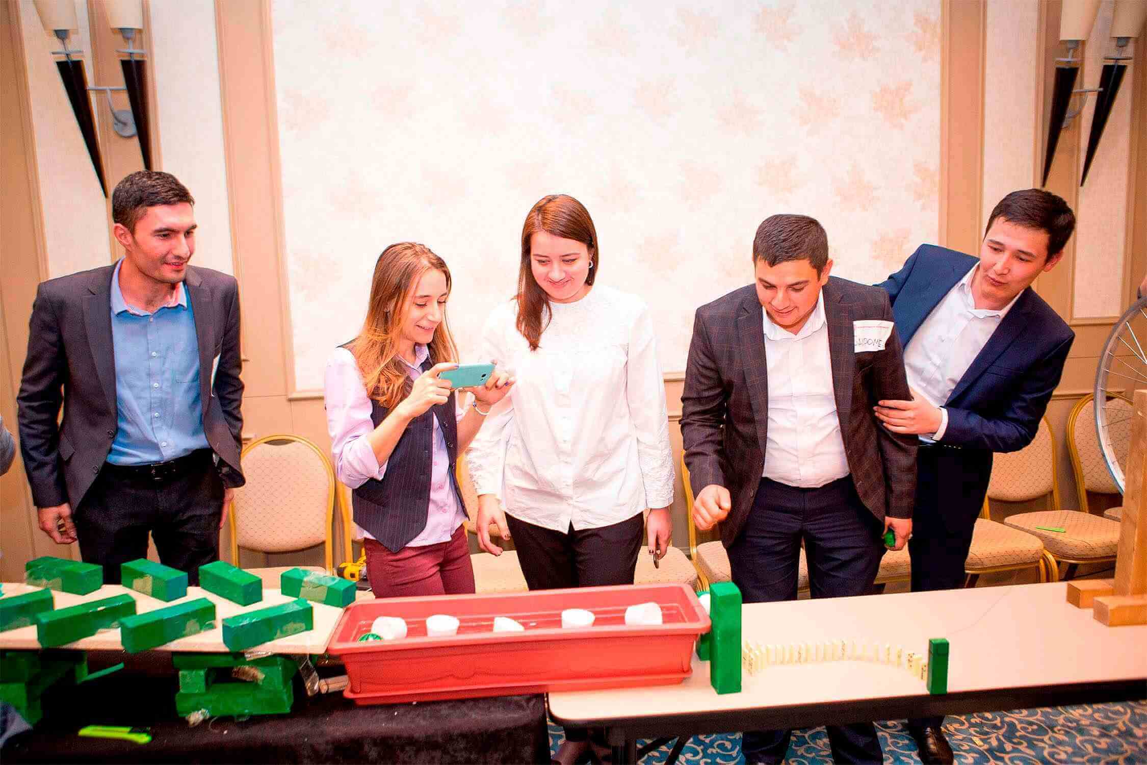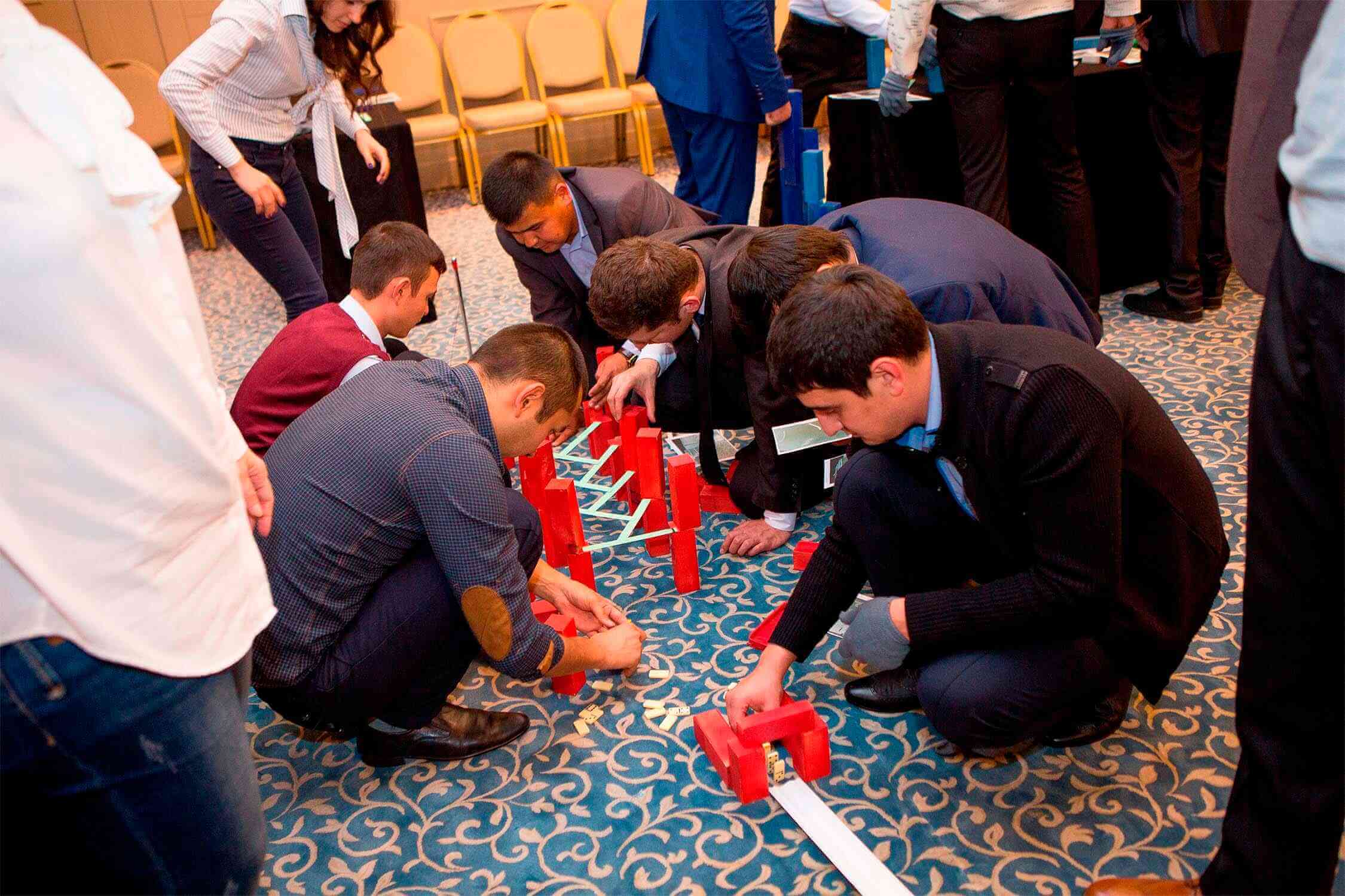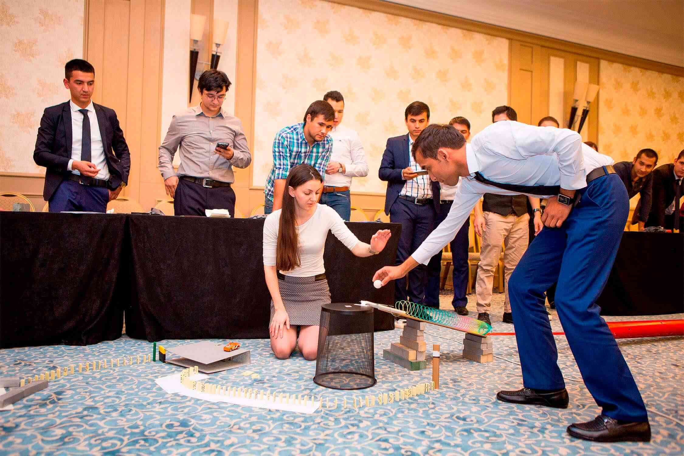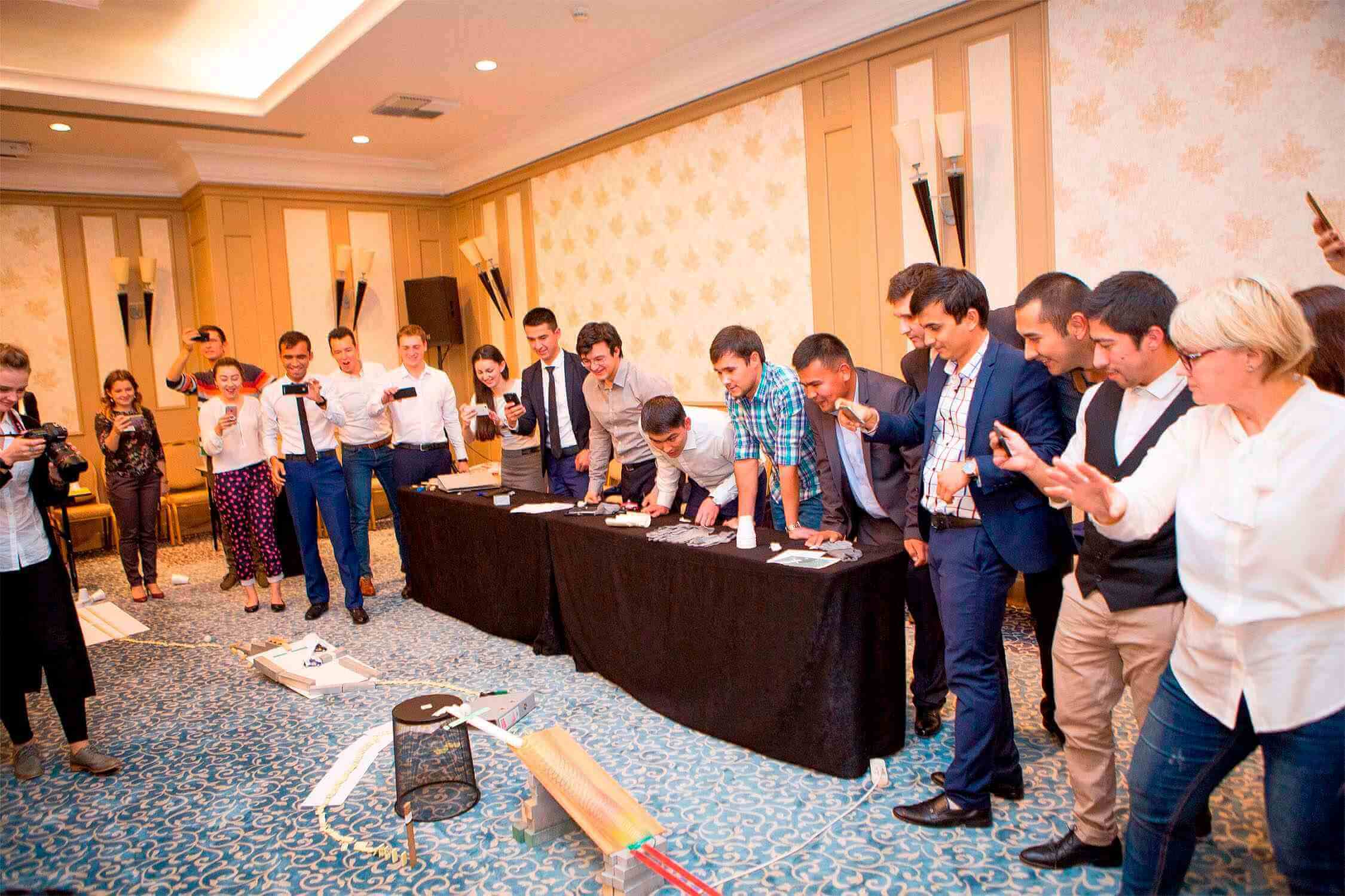 Тимбилдинг прошел в рамках Дня молодого специалиста, где после тренинга, сотрудники разделились на команды и собрали единый механизм, который запустили одним движением в торжественной обстановке.